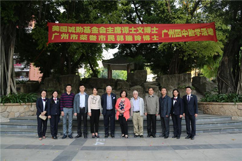 为了贯彻落实习近平总书记对广东提出的“四个走在全国前列”的要求,在营造共建共治共享社会治理格局上发挥侨界的智慧和力量,3月23日下午,荔湾区侨联、荔湾区教育局、广州市第四中学联合举办“美国诚助基金会主席谭士文博士、广州市荣誉市民郭瑞玲博士——爱心助学捐赠仪式”。广州市侨联副主席卢启明、市侨联文化联谊部部长巴尚清出席捐赠仪式。 谭士文博士 郭瑞玲博士参观广州市第四中学。 郭博士在助学仪式上发表讲话。 广州市侨联副主席卢启明先生与谭士文、郭瑞玲博士伉俪及区侨联、区教育局领导、四中老师合影。 谭士文博士、郭瑞玲博士首先参观了广州市第四中学的宣传长廊、校史馆、科技馆、心理咨询室,听取校方介绍了办学情况和办学业绩,两位博士对四中的教学环境和教学质量非常赞赏。 谭士文博士祖籍新会古井镇,郭瑞玲博士祖居荔湾。他们旅居美国旧金山,长期致力于推动广州市与旧金山及湾区城市的交流合作,为两地教育、文化、医疗卫生和高级公务员培训领域的合作做出了突出贡献,是推动广州与该地区交流的重要代表人物。多年来,郭瑞玲博士坚持每年回国义务讲学,推动医疗及中国“希望教育工程”等慈善事业。 (来源: 广州市荔湾区侨联 作者: 荔湾区侨联)