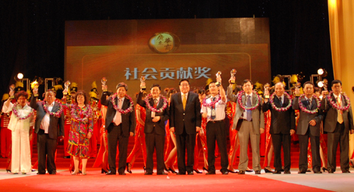 侨鑫集团、完美(中国)日用品有限公司、东莞玖龙纸业有限公司 荣获“特别贡献奖”国务院侨办李海峰主任(右二)为获奖企业颁奖 我会会员企业侨兴集团等荣获“经济贡献奖” 致公党中央副主席李卓彬(中)为获奖企业颁奖 我会会员企业华美集团、中港皮业集团、广州康寿颐养院等荣获“社会贡献奖”, 香港中联办主任、全国人大华侨委员会主任高祀仁(中)为获奖企业代表颁奖