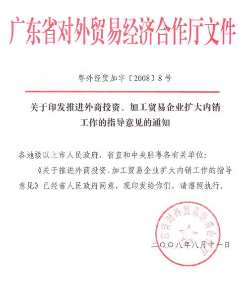 为深入贯彻落实科学发展观,进一步解放思想,促进加工贸易持续健康发展,推动外商投资、加工贸易企业增强竞争力,促进内外源经济协调发展,加快实现加工贸易转型升级,现就推进外商投资、加工贸易企业内销工作提出如下意见: 一、深刻认识推进外商投资、加工贸易企业扩大内销工作的重要意义 推进外商投资、加工贸易企业扩大内销是贯彻党的十七大和省委十届二次、三次全会精神,树立和落实科学发展观,继续当好全国外经贸发展排头兵的重要举措; 是破解发展难题、争创新优势,促进加工贸易转型升级,实现新一轮大发展的必然要求;是增加国家的关税收入和地方的增值税收入,减少我国外贸顺差,扩大国内市场供应,促进地方经济发展的有效途径;是外商投资、加工贸易企业充分利用国际国内两个市场两种资源,开展自主研发,形成自主技术、自主品牌,增强竞争能力的现实选择。各地各有关部门要从全局和战略的高度,深刻认识推进外商投资、加工贸易企业扩大内销的重要意义,与时俱进,更新观念,创新思路,创新体制,积极探索,加快推进这项工作。 二、推进外商投资、加工贸易企业扩大内销的指导思想和原则 (一)指导思想。深入贯彻落实科学发展观,深入贯彻党的十七大和省委十届二次、三次全会精神,以新一轮思想大解放为动力,坚持“市场运作、政府引导、协调联动”的方针,积极稳妥地推进外商投资、加工贸易企业扩大内销,实现加工贸易转型升级,推动我省加快转变外贸增长方式,促进我省经济社会又好又快发展。 (二)原则。坚持以市场为导向,以外商投资、加工贸易企业自愿内销为前提,运用市场经济的原则、方法和手段,充分发挥市场机制在资源配置中的基础性作用和企业的市场主体作用;坚持政府推动与遵循市场规律相结合,在遵循企业经营客观规律基础上,政府要因势利导,创造条件,通过搭建平台、政策支持等措施,引导扩大外商投资、加工贸易企业内销。 三、推进外商投资、加工贸易企业扩大内销的若干措施 (一)加强对外商投资、加工贸易企业开展内销业务的指导。各有关部门要积极主动地向基层和企业宣传国家有关加工贸易转内销的最新政策,帮助企业了解掌握政策。同时,鼓励、支持、引导外商投资、加工贸易企业通过一般贸易生产和自主经营,开展内销业务,建立内销服务网络体系,争创内销品牌,扩大产品内销比重,提高国内市场占有率。 (二)营造良好的内销环境,提高管理服务水平。加工贸易转内销是一项政策性较强的工作,各市各部门要加强对所辖县(区)有关部门的业务指导,认真掌握国家有关加工贸易转内销的新政策、用好新政策。加强和完善内销统计体系,各级外经贸主管部门定期上报本市外商投资、加工贸易企业内销以及加工贸易转内销的有关情况。加强政务环境建设,增强服务意识,进一步提高审批通关效率,向企业提供优质高效服务,使企业加工贸易转内销渠道畅通无阻。同时,外经贸、海关、检验检疫等有关部门要加强沟通与联系,积极探索企业开展内销的管理服务新途径,为外商投资、加工贸易企业转内销提供高效便捷的服务。 (三)鼓励外商投资、加工贸易企业开拓国内市场。引导和鼓励外商投资、加工贸易企业通过一般贸易方式,生产适销国内市场的产品,积极拓展内销业务,扩大产品内销,并逐步建立起国内营销和物流体系。支持企业创立内销品牌,扩大产品在国内的知名度和影响力,并带动一批国际知名品牌进入国内市场。同时,积极协助企业办理增设国内分销业务等,组织和引导企业参加国内展览会、展销会,为产品进入国内市场提供良好的展示和服务平台。 (四)建立内销跟踪管理和服务机制。加强对加工贸易重点地区、重点行业、重点企业(内销大户)的跟踪管理和服务,尤其是做好大型外商投资、加工贸易企业的内销服务工作。建立联系沟通机制,及时掌握外商投资、加工贸易企业在扩大内销方面遇到的困难和问题,积极予以协调解决。同时,充分调查掌握企业开拓国内市场的意愿,协助和推动更多的外商投资、加工贸易企业扩大国内市场份额。 (五)加强外商投资、加工贸易企业扩大内销工作的资金扶持力度。对内销纳税大户,创立了内销品牌的外商投资、加工贸易企业,推进外商投资、加工贸易企业扩大内销工作中取得突出成绩的市和部门进行奖励,充分调动各方面参与扩大内销工作的积极性。 四、组织保障 (一)加强组织领导。省政府建立由分管副省长为召集人,省财政厅、外经贸厅、国税局、地税局、海关广东分署和广东检验检疫局等有关部门、单位领导参与的“省推进加工贸易扩大内销联席会议”制度,负责统筹协调指导全省加工贸易扩大内销过程中出现的重大问题,日常工作由省外经贸厅负责。各地要建立相应机制,明确责任,抓紧组织编制加工贸易扩大内销的规划和工作方案,尽快出台配套政策措施和具体实施意见。 (二)实施目标考核。各级党委、政府和有关部门要把扩大加工贸易内销工作纳入当地外经贸发展规划和年度工作考核,并作为绩效考核的重要内容。实行领导负责制,并加强调查统计与研究分析。 (三)落实资金保障。省财政安排资金,对扩大外商投资、加工贸易企业内销给予奖励,具体由省外经贸厅会同省财政厅、国税局、海关广东分署根据当年外商投资、加工贸易企